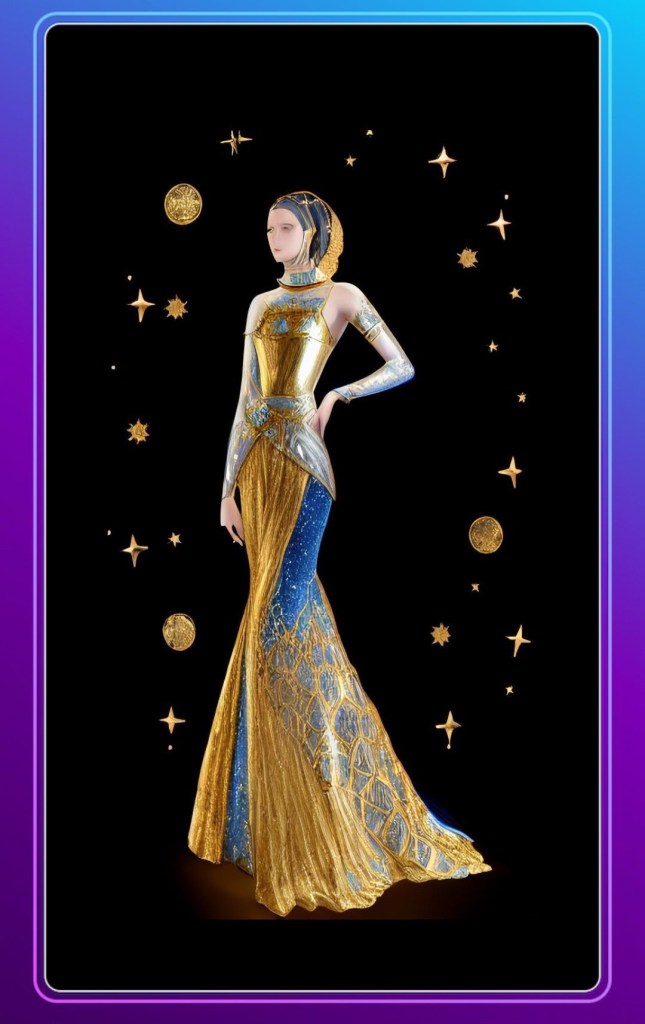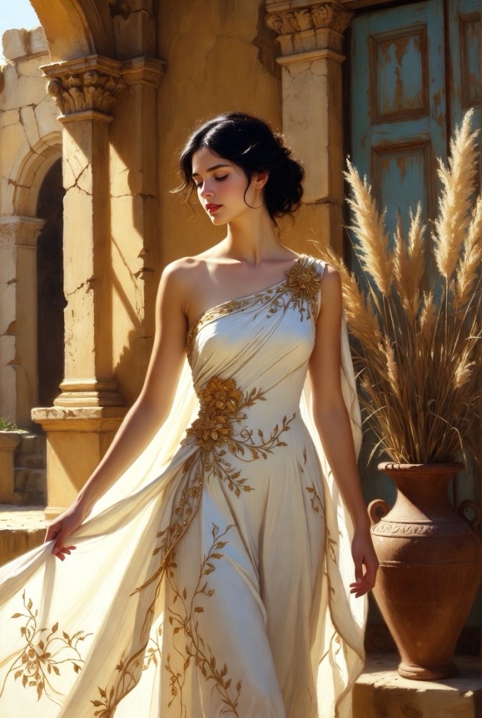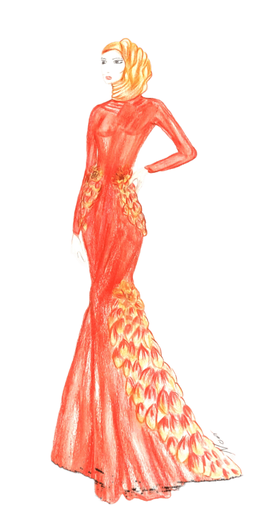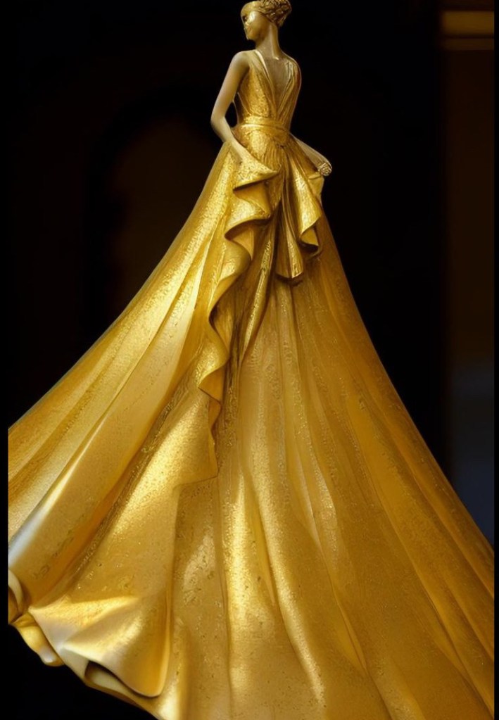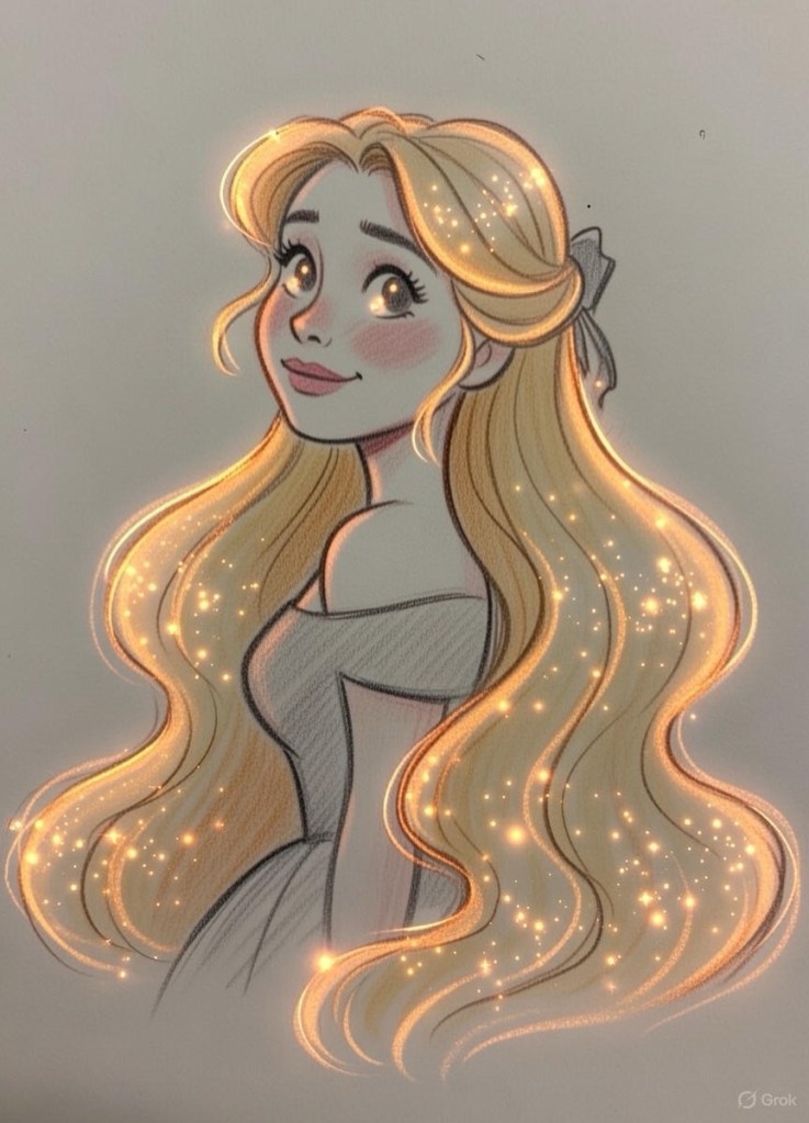 Prompt: Die Gesichtszüge sollten erkennbar bleiben, und Pose, Hintergrund, Kleid und Schal müssen exakt gleich sein. Gesicht, Kleid und Schal: Gestalten Sie eine skizzenhafte, halbrealistische Illustration in einem weichen, künstlerischen Bleistift- oder Buntstiftstil. Sie fängt ihr charmantes Lächeln ein, ihr Blick leicht nach oben gerichtet, mit einem sanften, verträumten Lächeln. Schal: Ihr charakteristischer, ultralanger, goldener Kopftuch fällt dicht und dramatisch nach unten und glänzt in warmen, goldgelben Glitzerpartikeln und schimmernden Highlights, die ihm einen magischen Zauber verleihen.